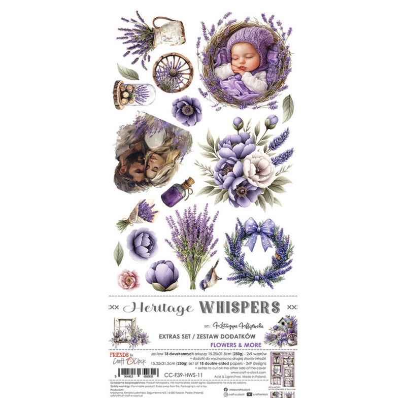 Sada 18 oboustranně potištěných papírů zn. Craft O'Clock o rozměru 15,25x31,5cm. 2x9 různých designů + bonusy ve formě potištěné rubové strany obálky. Gramáž papírů 250g/m2. Acid&lignin free. Nevhodné pro děti do 3 let.
