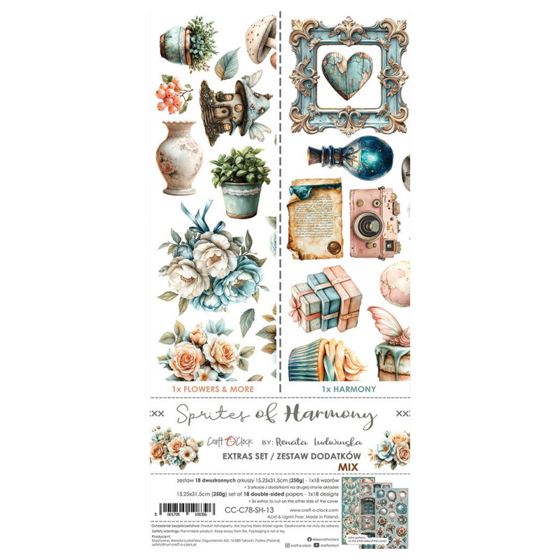 Sada 18 oboustranně potištěných papírů zn. Craft O'Clock o rozměru 15,25x31,5cm. 2x9 různých designů + bonusy ve formě potištěné rubové strany obálky. Gramáž papírů 250g/m2. Acid&lignin free. Nevhodné pro děti do 3 let.