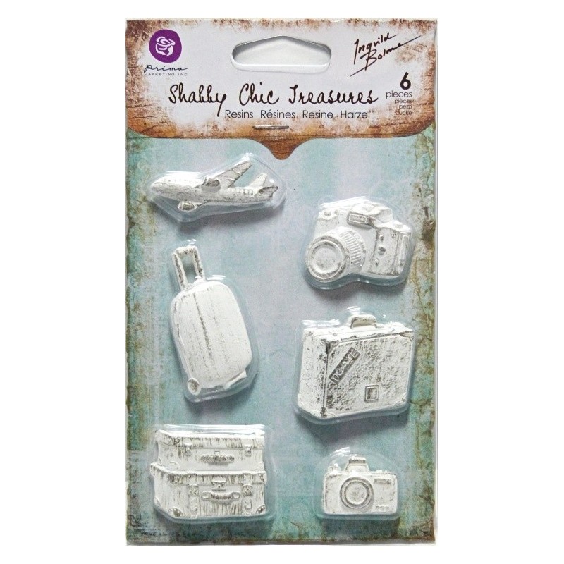 Sada drobných dekorací z pryskyřice. Velikost motivů: např. menší fotoaparát 2,5x2cm, dva kufry na sobě 4x2,7cm. Určeno pro techniku scrapbooking popř. jiné dekorace. Nevhodné pro děti do 12-ti let.