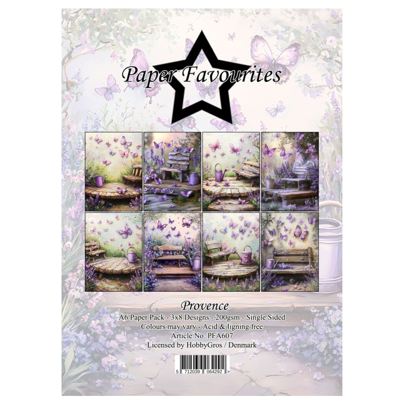 Sada papírů o rozměru A6. Obsahuje 24 různě vzorkovaných listů. V sadě je 8 vzorů, každý po třech kusech. Neobsahuje kyselinu ani lignin. Gramáž papíru 200g/m². Nevhodné pro děti do 3 let.