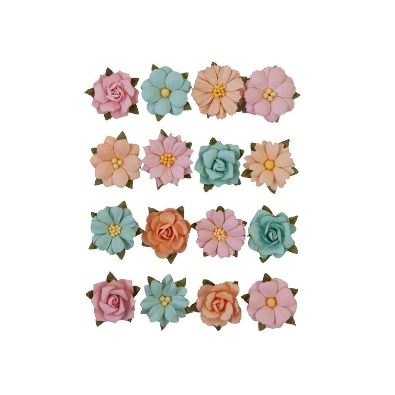 Set papírových květů pro scrapbook a cardmaking. Velikosti květů: průměr cca 20mm a 25mm. Celkem 16ks. Výrobek firmy Prima Marketing Inc. Nevhodné pro děti do 14 let.