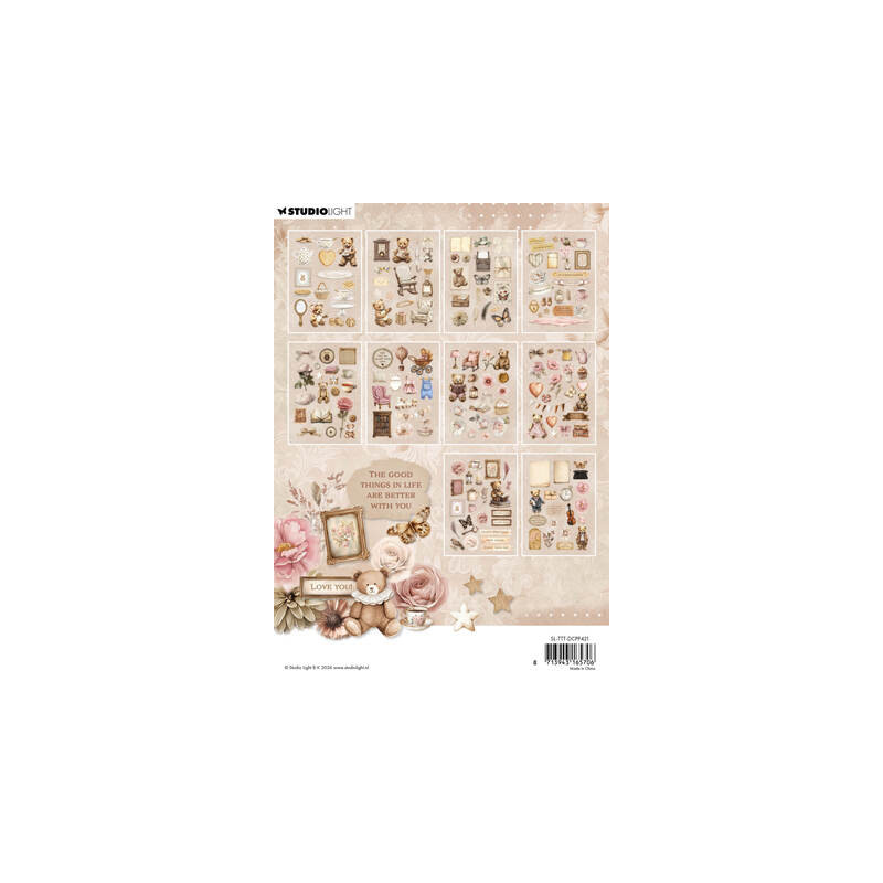 Sešit 20 listů papírových výřezů s tématicky sladěnými motivy. Vhodné pro scrapbooking, výrobu přáníček a dekorací. Celkem více než 300 kusů. Rozměr A5. Nevhodné pro děti do 3 let.