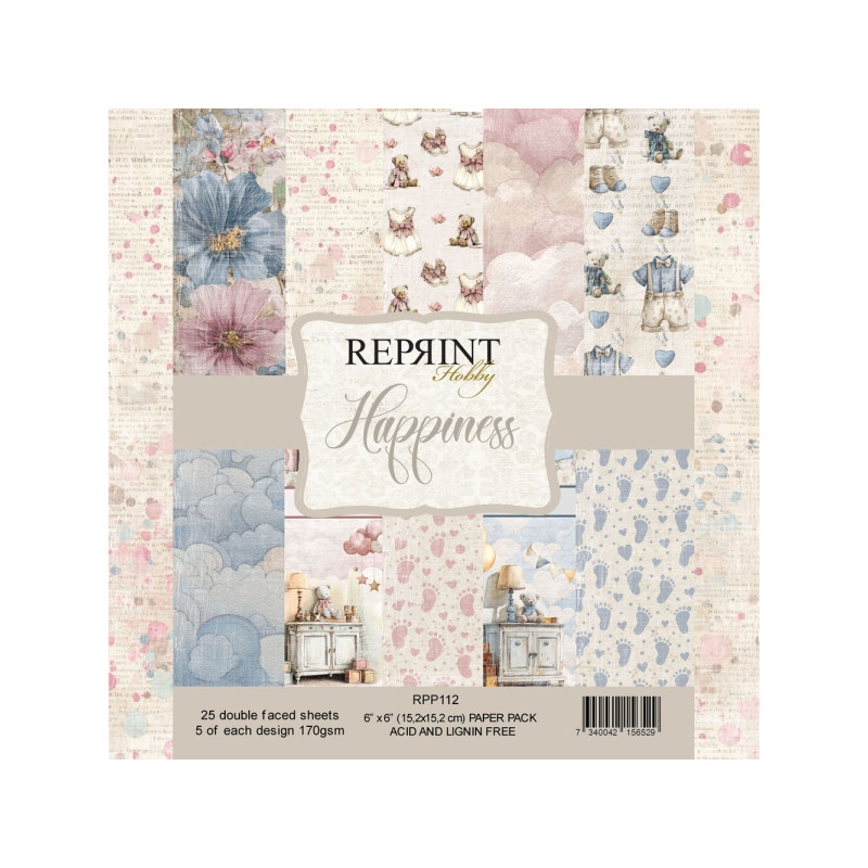 Designový papír švédské firmy Reprint. Velikost 15,2x15,2cm, gramáž 170gsm. 25 ks oboustranně potištěných papírů, 5 designů, každý po 5ks. Acid & lignin free. Nevhodné pro děti do tří let.