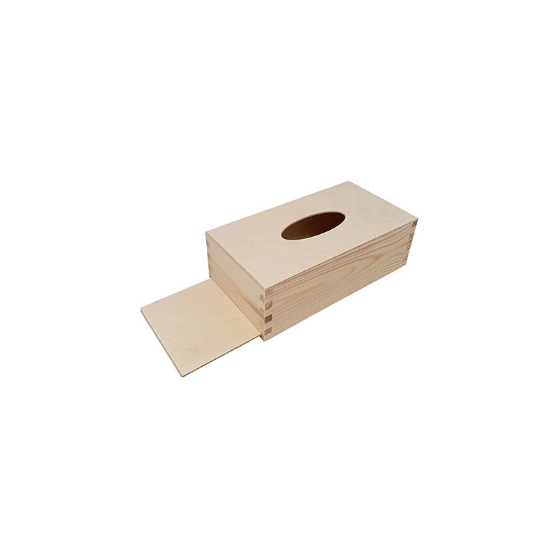 Poklop z borovicového dřeva se spodním vysouvacím dnem, nelakovaný. Je určený k dekorování ubrouskovou technikou. Rozměr cca 25,5x13,2cm, výška 8,3cm. Otvor má rozměr cca 13x6cm. Nevhodné pro děti do tří let.