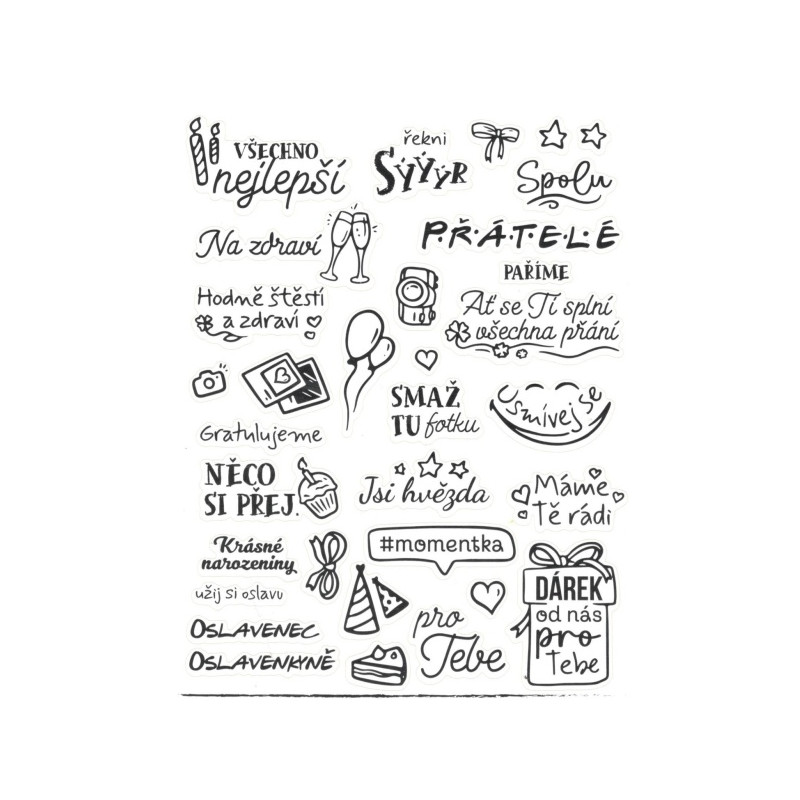 Samolepky vhodné pro scrapbooking, na výrobu přáníček, na zdobení sešitů, bloků, diářů apod. Rozměry archu cca 15x21cm. Rozměry plochy se samolepkami 14,5x18,5cm. Samolepky jsou natištěny na bílém archu, předvyseknuté s okrajem, neprůhledné. Nevhodné pro děti do tří let.