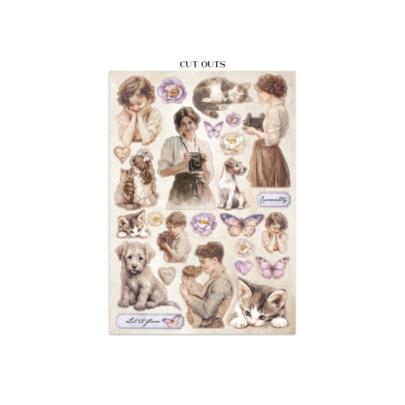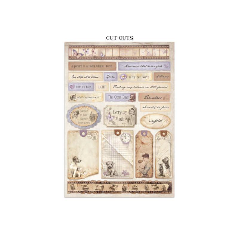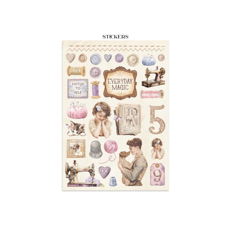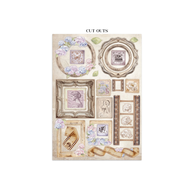 Kreativní kniha o velikosti A4 s obrázky pozadí, samolepkami, předvyřezanými motivy a motivy k vystřižení. Celkem 16 stran pro tvorbu přáníček, alb, zápisníků a dekorací. 8 stran oboustranný karton 220g/m2, 4 strany samolepek 120g/m2, 4 strany oboustranných výřezů 220g/m2. Bez kyselin. Nevhodné pro děti do 3 let.