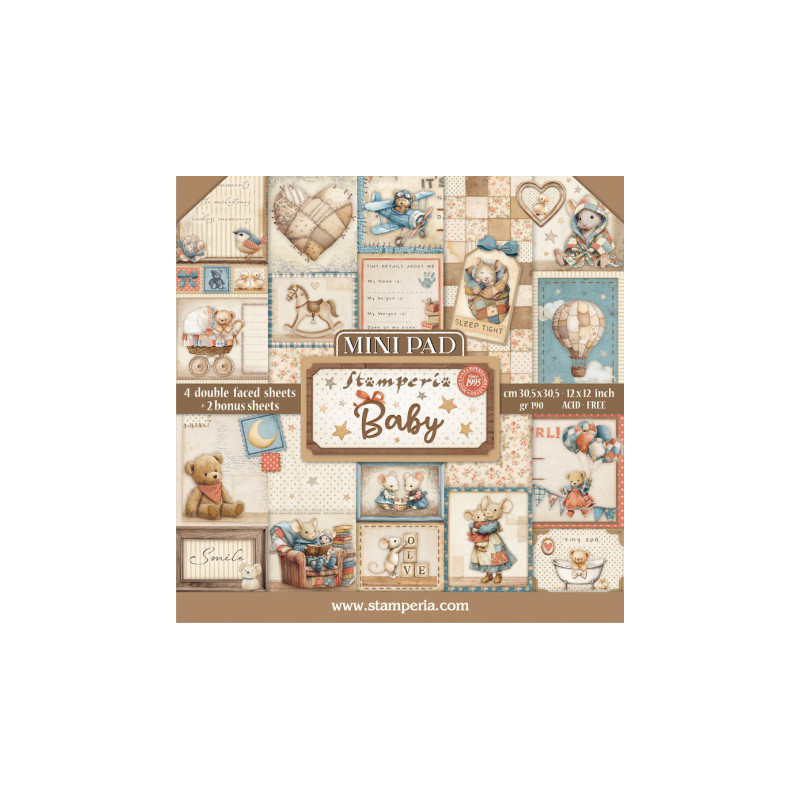 Sada papírů zn. Stamperia o rozměru 30,5x30,5cm. Obsahuje 4ks oboustranně potištěných listů, každý s jiným motivem. Jako bonus potištěné strany titulního a zadního listu. Gramáž papírů 190g/m2, acid free. Nevhodné pro děti do 3 let.