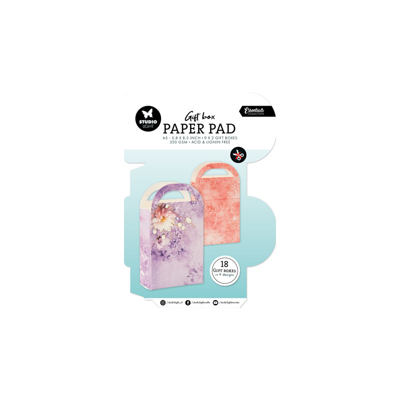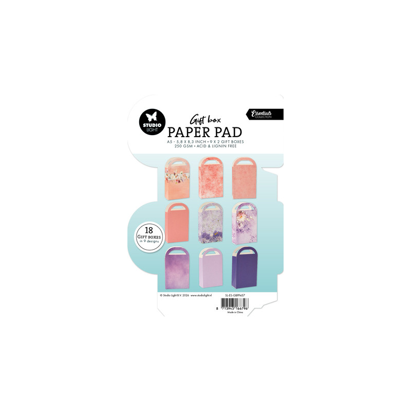 Sada základů ke složení dárkových taštiček. Obsahuje 18 taštiček v devíti designech. Každá taštička je narýhována, stačí ji ze sady vytrhnou a složit. Získáte taštičku o velikosti 7x12x3cm. K výrobě budete potřebovat jen lepidlo nebo lepicí pásku. Gramáž papíru 250g/m2. Výrobek značky Studio Light. Nevhodné pro děti do 3 let.