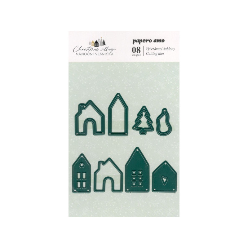Vyřezávací šablony vhodné pro Big shot a podobné přístroje. Při vyřezávání se řiďte návodem výrobce přístroje. Šablony jsou vhodné pro papír do 220g/m2, pěnovku, filc apod. Celkem 8ks šablon, velikost domečků cca 2,2x2,7 cm. Nevhodné pro děti do 3 let.